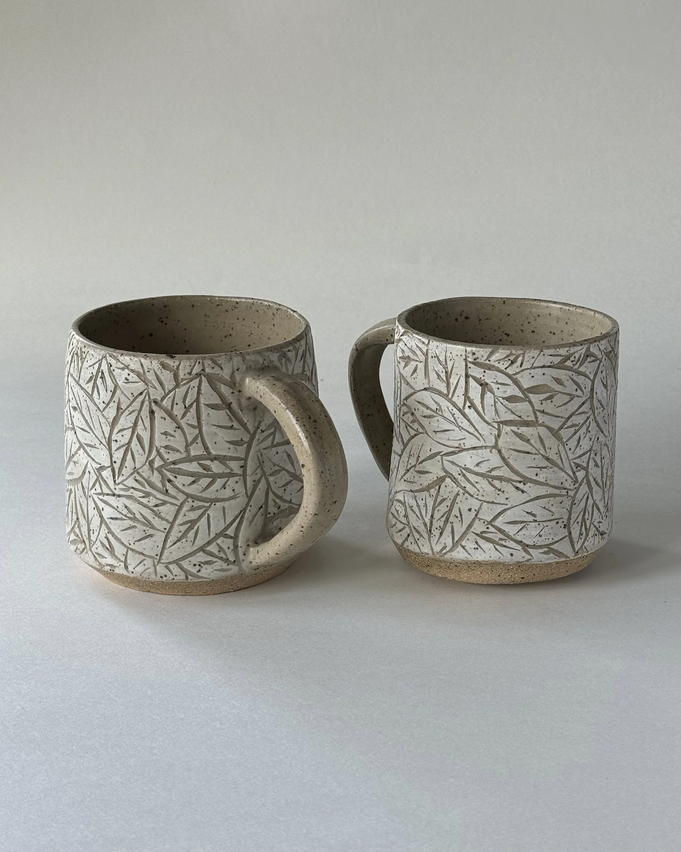 Set of 2 Mugs/Cups in White/Beige with Engraved Leaf Designs $90